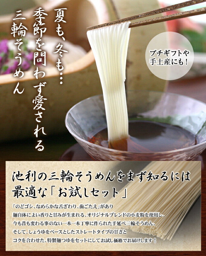 三輪そうめんつゆ付きお試しセット(約3人前)【プチギフト 手土産 プレゼント そうめん 素麺 ソーメン】【送料無料※北海道・沖縄・離島は別途1,000円】池利