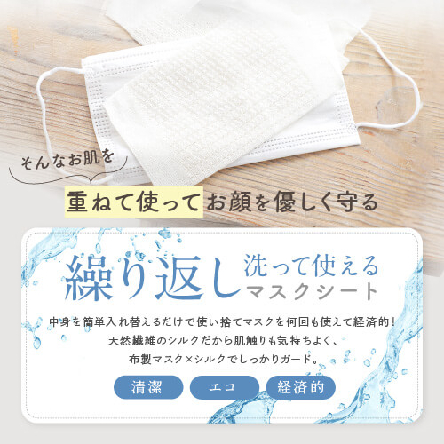 マスク用の取り替えシートです。重ねて使ってお顔を優しく守ります。洗って繰り返し使えるマスクシート。程よいサイズで、どんなマスクでも対応可能です。